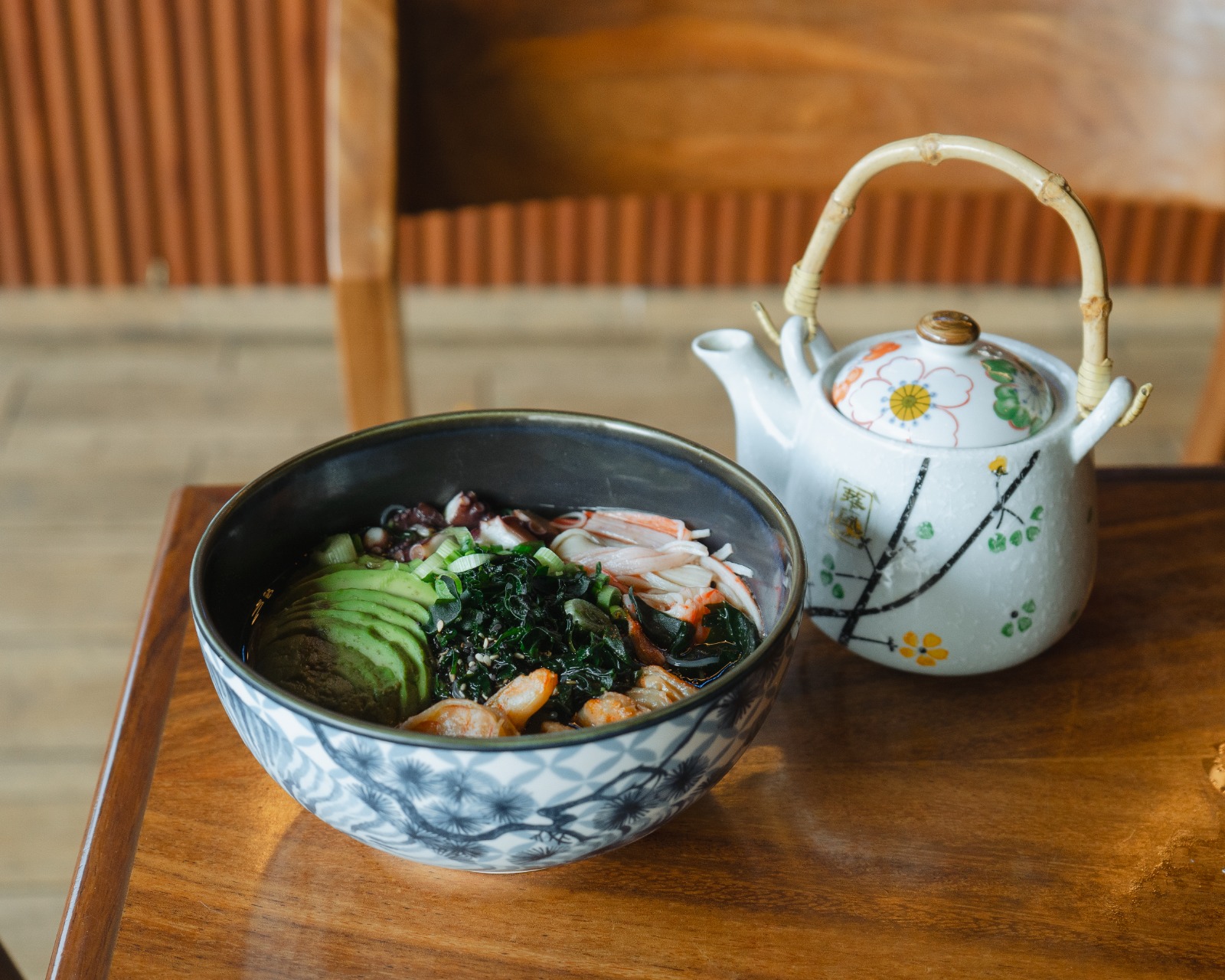 Sopa de mariscos con pulpo, camarón, kanikama, aguacate, fideos de arroz y caldo dashi.